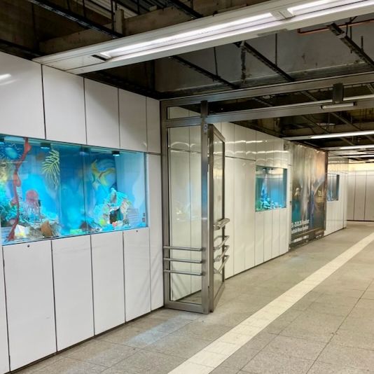 Die Eckvitrine liegt gegenüber auf dem Gleis im Zugang der U-Bahnen Richtung Südbahnhof (U1–U8), vor dem Aufgang zur Zeil